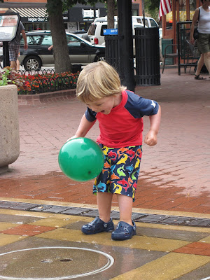 Bubsy happily surprised by the bubbling water-play fountain on Pearl Street in Boulder.