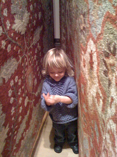 Now he is tall, and quite long in the torso, much like his dada. Recently Bubbe made him this beautiful red sweater and a vest with the same yarn.